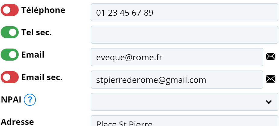 Il peut aussi choisir de diffuser ou masquer ses emails et téléphones (privé/public) sur les sites publics du diocèse ou paroissial, notamment dans le cadre de ses activités pastorales (responsable de groupe par exemple).